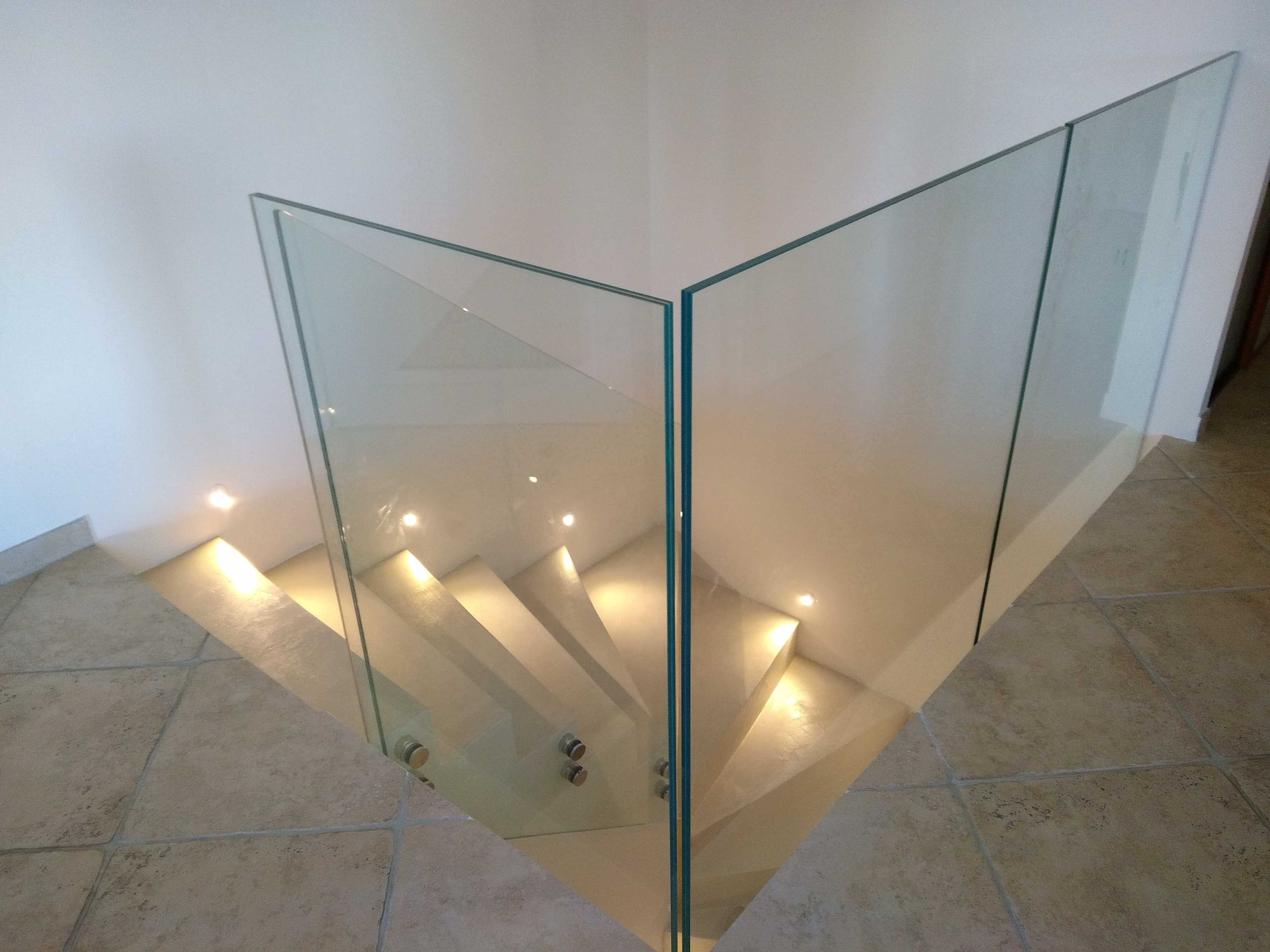Notre client souhaitait moderniser et éclairer sa cage d’escalier avec l’installation d’un garde-corps en verre à fixation par points.